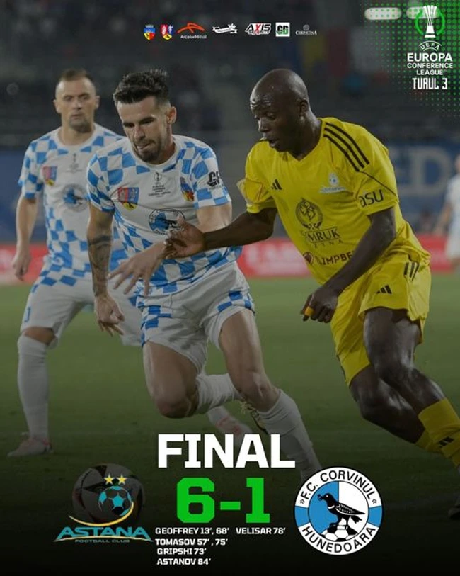 0Corvinul Hunedoara a fost eliminată din Conference League la fotbal, de FC Astana în manşa secundă din turul al treilea preliminar. Echipa kazahă s-a impus cu scorul de 6-1 (1-0), miercuri, pe Stadionul Almatî Ortalik din Almatî.