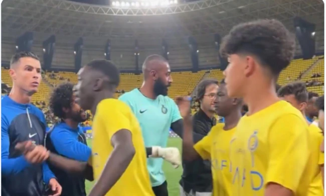 În momentul în care l-a văzut, Ronaldo s-a schimbat la față, i-a făcut semn din ochi să intre în rând, iar când a văzut că fiul său nu vrea să se conformeze, i-a aruncat câteva reproșuri băiatului său. Juniorul s-a oprit să îl asculte, însă nu s-a lăsat înduplecat și și-a continuat drumul.