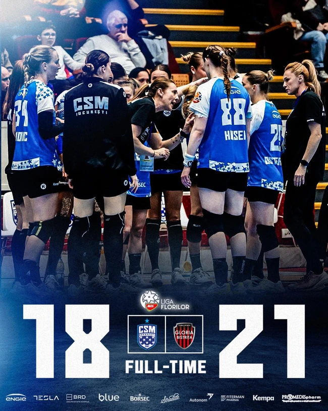 0CSM București, campioana en titre, a fost învinsă de CS Gloria Bistrița cu scorul de 21-18 (13-9), luni, în Sala Polivalentă din Capitală, într-un meci din etapa a 18-a a Ligii Naționale feminine de handbal.