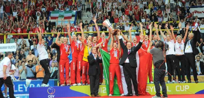 La feminin, Cupa CEV a fost câştigată de formaţia italiană Yamamay Busto Arsizio, după o dublă manşă de foc. Învinsă cu 3:1 (16, -22, 23, 22) la Istanbul, de Galatasaray, gruparea peninsulară s-a impus la aceeaşi diferenţă pe teren propriU: 3:1 (19, 13, -23, 23). Departajarea s-a făcut într-un set suplimentar, "setul de aur". Arsizio s-a impus cu 15-9.