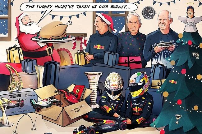 În cartonașul afișat pe rețelele de socializare ale echipei Red Bull, se observă un Moș Crăciun purtând un curcan spunând: „curcanul ar putea să ne fi depășit bugetul”, asta într-o referire clară la sancțiunea primită de echipa la care concurează Sergio „Checo”. Pérez pentru că a depășit cu aproape două milioane de dolari cheltuielile sezonului precedent din cauza cheltuielilor de catering.