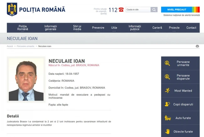 Fostul boss de sub Tâmpa, Ioan Neculaie (64 de ani), condamnat definitiv la doi ani şi două luni de închisoare cu executare, e dat dispărut. Poliţia Română l-a dat în urmărire generală!
