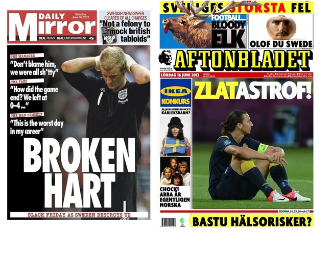 Primii care au lovit au fost suedezii. Ziariştii de la "Aftonbladet", un tabloid din Suedia, şi-au imaginat cum va arăta prima pagină a ediţiei de mâine a tabloidului din Anglia "Daily Mirror" după eventuala înfrângere a echipei lui Roy Hodgson în meciul din seara aceasta cu naţionala lui Ibrahimovici, care se va disputa de la ora 21.45.