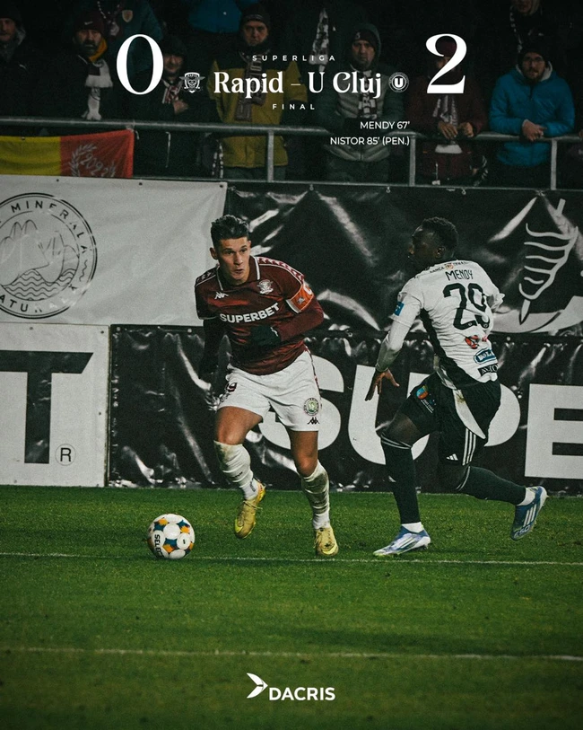 ”Nașa” giuleștenilor din ultimii ani, U Cluj a obţinut sâmbătă seară a patra sa victorie consecutivă pe terenul Rapidului, prin golurile marcate de francezul Oucasse Mendy (67), în urma unui corner, la debutul său în Superligă, şi de veteranul Dan Nistor (85), dintr-un penalty scos de acelaşi Mendy. Oaspeţii au mai avut ocazii clare de gol prin Ovidiu Bic (8, 66) şi Issouf Macalou (69).