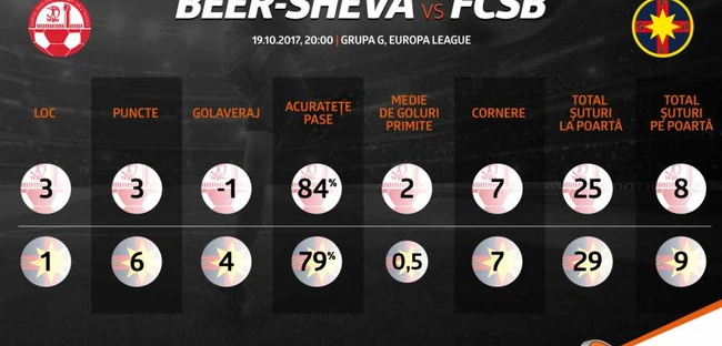 Infograficul de mai sus, realizat de operatorul digital de pariuri sportive şi cazinou Betano.com, le compară pe combatantele de diseară luând în considerare câteva cifre importante. Privindu-le, se poate vedea că israelienii sunt mai incomozi decât par. Au adunat trei puncte în Grupa G, graţie unei victorii cu 2-1 pe teren propriu contra elveţienilor de la Lugano, au o mai bună acurateţe a paselor decât FCSB şi sunt foarte aproape de performanţele roş-albaştrilor în ceea ce priveşte şuturile la poartă, şuturile spre poartă şi cornere. FCSB se va duela cu un adversar care ştie să atace, adică unul similar cu filosofia de joc impusă şi de Nicolae Dică.