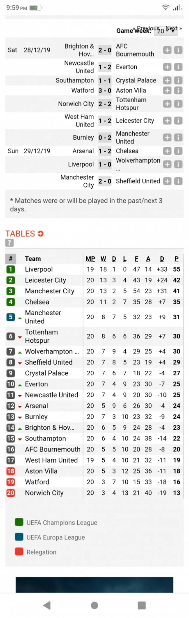 Iată cum arată acum clasamentul din Premier League după 20 de etape, cu precizarea că Liverpool are o restanţă, comparativ cu urmăritoarele sale:
