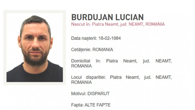 IPJ Neamț a venit cu noi detalii: „La data de 20 octombrie a.c., polițiștii din cadrul Poliției municipiului Piatra-Neamț au fost sesizați, de către o femeie în vârstă de 63 de ani, cu privire la faptul că, din cursul lunii septembrie a.c., niciun membru al familiei nu a mai putut lua legătura cu fiul său BURDUJAN LUCIAN, în vârstă de 38 de ani, din Piatra-Neamț.
