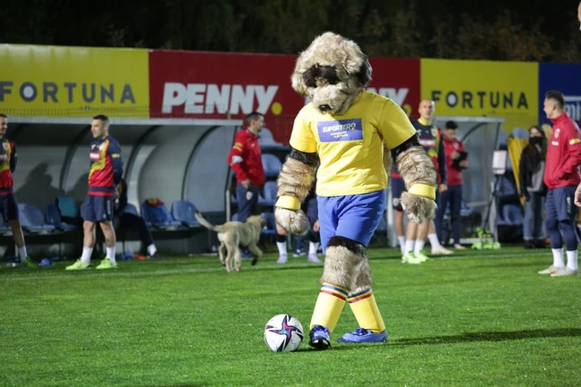 0La antrenamentul de aseară al tricolorilor pregătiţi de Mirel Rădoi a apărut şi noua mascotă a suporterilor României.