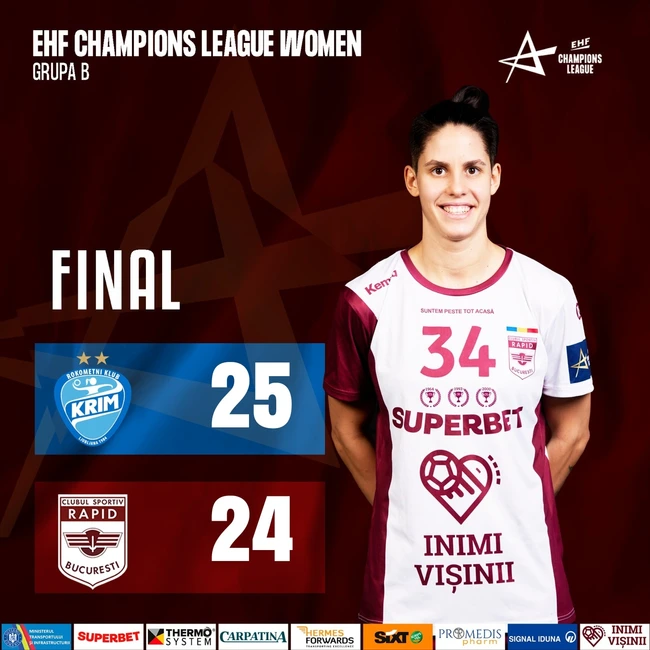 0Rapid a pierdut deplasarea cu Krim Ljubljana, din Liga Campionilor la handbal feminin, scor 24-25.