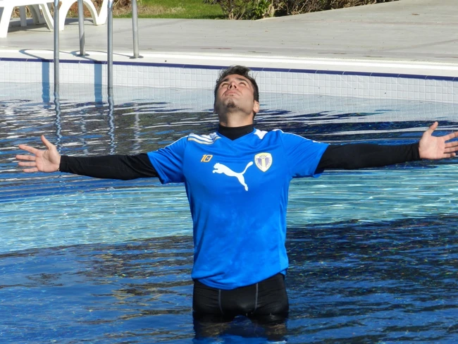 După antrenamentul intens de ieri dimineaţă, „lupii” au inaugurat piscina exterioară a hotelului unde sunt cazaţi. Dar nu pentru a se bălăci, apa fiind destul de rece, dar excelentă pentru relaxarea musculaturii. Adrian Mutu, De Lucas, Fernandez şi Contra au simtit din plin beneficiile acestei terapii, după o sedinţă de pregătire în care antrenorul Petrolului a alergat cot la cot cu jucătorii săi. Mutu s-a bucurat din plin şi de soare, pozând într-o impostază sugestivă ce ar putea fi completată cu expresia: ”Dă -mi, Doamne, titlul cu Petrolul!”