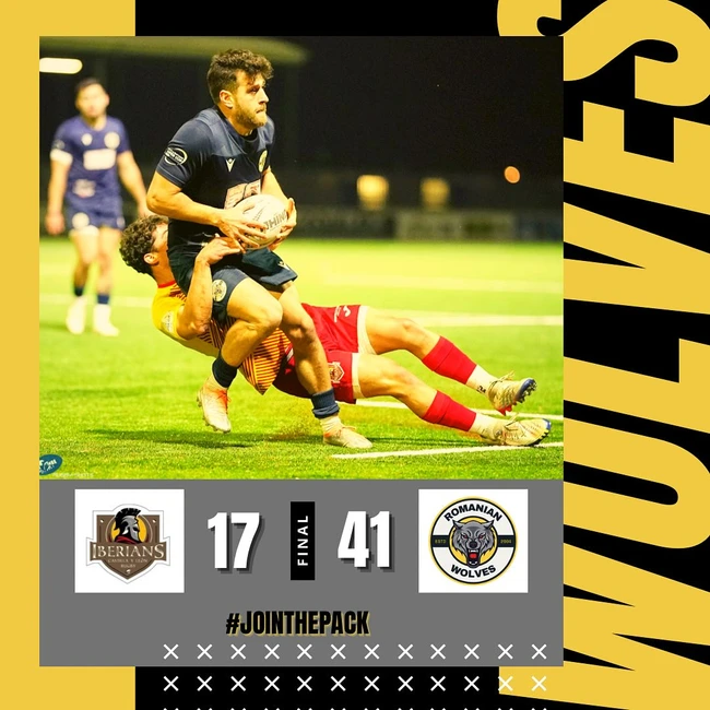 Romanian Wolves a înscris şase eseuri, prin Mate Dardzulidze (trei), Jason Tomane, Beka Biţadze şi Paul Popoaia, care a transformat patru dintre ele şi a reuşit şi o lovitură de pedeapsă, potrivit site-ului Federaţiei Române de Rugby.