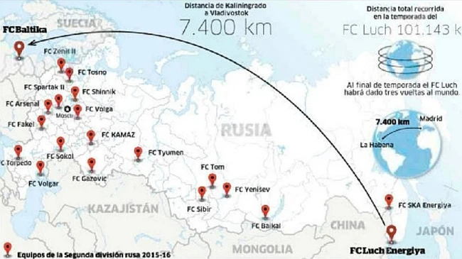 Luch Energya Vladivostok, din liga a doua rusă, este cea mai năpăstuită echipă din acest eşalon. Situat în extremitatea sud-estică a ţării, clubul respectiv face deplăsări imense în campionat. Ieri, jucătorii de la Luch Vladivostok au avut meci la Kaliningrad, cu Baltika, adică exat în direcţia opusă.