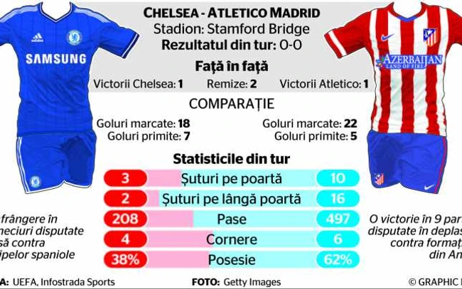În tur, săptămâna trecută, Chelsea a obţinut un egal pe terenul lui Atletico, într-un meci în care ofensiva lui Mourinho a avut doar sarcini defensive. A fost un 0-0 chinuit, mulţumitor însă pentru londonezi, bine-dresaţi de tehnicianul portughez în tactica antijocului. Ca să meargă mai departe însă, Chelsea trebuie să învingă pe teren propriu sau măcar să păstreze scorul din tur şi ducă meciul la penalty-uri, unde orice se poate întâmpla.
