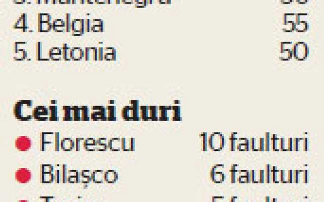 Adică aproape 20 pe meci, medie cu care nu se mai poate „mândri" nicio altă echipă dintre cele 51 ale preliminariilor. Poate doar Insulele Feroe, cu acelaşi număr de faulturi (59), dar cu un meci mai mult disputat. Privind mai departe în Top 10, nu ne onorează deloc compania celor trei ţări baltice precum şi a „liliputanilor" din San Marino.