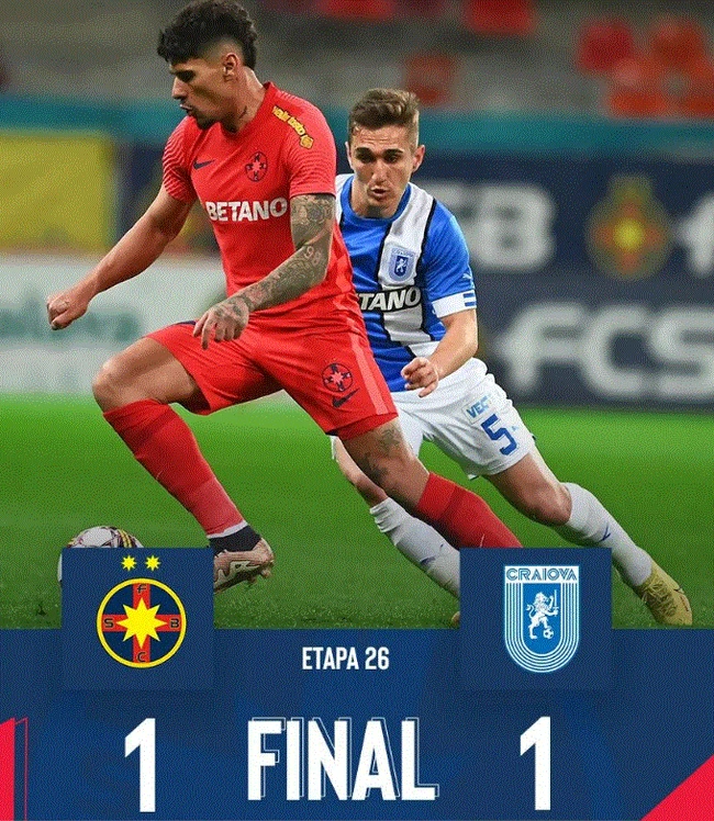 0FCSB şi Universitatea Craiova au terminat la egalitate, 1-1 (1-0), duminică seara, pe Arena Naţională din Bucureşti, într-un meci din etapa a 26-a a Superligii de fotbal.