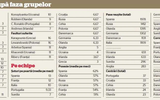 0După faza grupelor, Spania domină la toate clasamentele ofensive: naţionala lui Del Bosque e prima la posesie, şuturi pe poartă, cornere şi pase reuşite.
