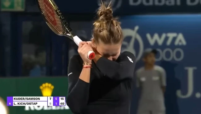 Letona se afla la fileu și a returnat o minge trimisă de Liudmila Samsonova și a lovit-o în față pe Veronika Kudermetova, care a dus imediat mâna la falcă și a acuzat dureri puternice.