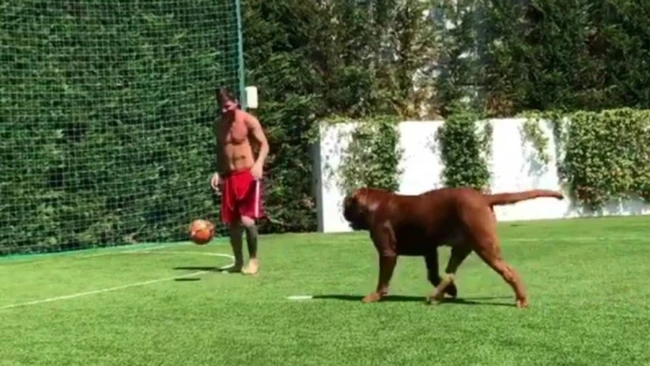 Argentinianul a postat pe reţelele sociale un video în care apare jucându-se cu Hulk, uriaşul său câine, pe care îl ameţeşte săltând mingea peste el de câteva ori.
