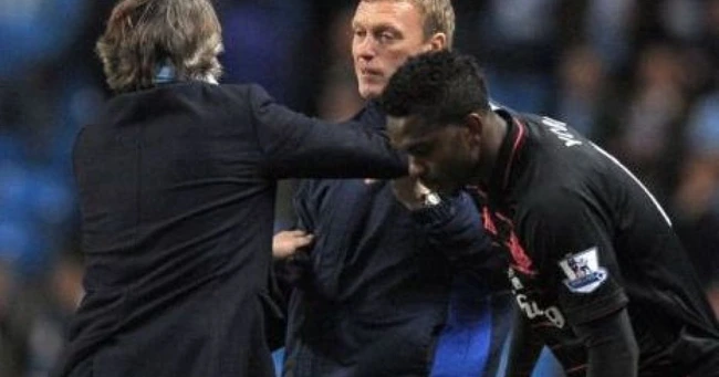 Şi antrenorul lui Everton, Moyes a intrat în joc, arestând o minge preţ de câteva zeci de secunde. Motiv pentru italianul Roberton Mancini să-l busculeze serios pe adversarul său de pe banca tehnică.