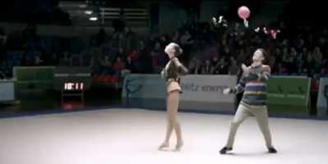 O tănără gimnastă este întreruptă din exerciţiul ei de către un spectator. Acesta este, fireşte, un amator de fotbal. Intervenţia sa este salutată de prietenii care se află în tribună.