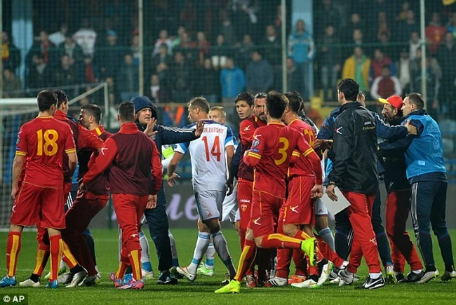 Meciul dintre cele două naţionale de fotbal, partidă în Grupa G a preliminariilor Euro 2016, a fost de la început tensionat. Arbitrii au întrerupt repede meciul pentru o jumătate de oră, după ce în primul minut portarul oaspeţilor, Igor Akinfeev, a fost lovit în cap de o torţă aruncată de suporterii formaţiei gazdă.