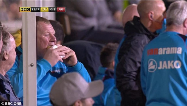 Meciul a prilejuit un moment hilar, camerele de luat vederi surprinzându-l pe Wayne Shaw, portarul de rezervă al celor de la Sutton, în timp ce mânca o plăcintă pe banca de rezerve.