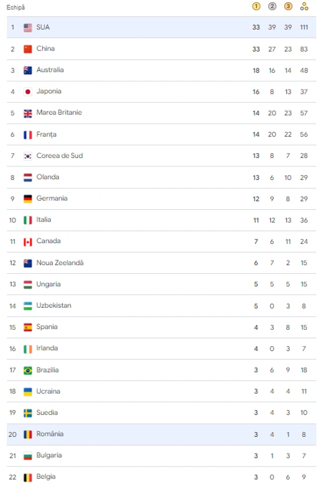 Delegaţia Statelor Unite este în continuare lider în clasamentul pe medalii la Jocurile Olimpice de la Paris, după întrecerile de vineri, a 14-a zi oficială de competiţii, în timp ce România a coborât de pe locul 14 pe 20. Americanii totalizează 33 de medalii de aur, 39 de argint şi 39 de bronz, fiind urmaţi de China (33-27-23) şi de Australia (18-16-14).