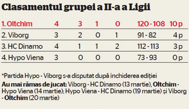 Rusoiacele au tras la poartă de la 10 metri, Ungureanu era bătută, dar bara a salvat Oltchimul de la înfrângere. După egalul inextremis smuls la Volgograd, oraş în care şi-au pierdut viaţa aproape 150.000 de români în al Doilea Război Mondial, vâlcencele se vor lupta acum cu danezele de la Viborg pentru primul loc în grupă.