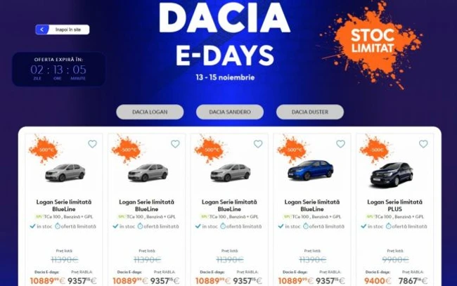 Acum, pe platforma Dacia, care poate fi accesată AICI, găsiţi oferta Dacia E-DAYS. În oferta specială veţi găsi modele Logan, Sandero şi Duster. Noi am numărat 14 modele Logan, 13 modele Sandero şi 4 Dustere în promoţie.
