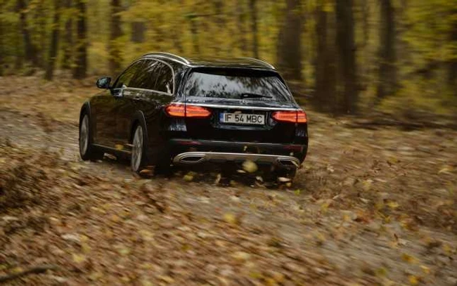 Deşi pe spatele modelului scrie 220d, sub capotă ave un propulsor nou de 1.950 cmc care dezvoltă 194 CP la 3.800 rpm şi 400 Nm între 1.600-2.800 rpm. Un motor uşor zgomotos la viteze reduse şi ralanti, după care zgomotul aerodinamic şi la rulare îl acoperă. Cutia automată cu 9 trepte îţi învaţă stilul de condus, şi după o perioadă uiţi că mai există. Am rămas puternic impresionaţi de consumul mediu extraurban, cei drept eram şi noi relaxaţi, dar 3,1 litri pentru un model de 5 metri şi aproape 2 tone... este o valoare impresionantă. În modul All Terrain, maşina se transformă într-un agregat care poate depăşi obstacole imposibile pentru un break clasic, dar nu trebuie să fii prea aventuros pentru că în offroad eşti limitat de consolele faţă/ spate. Sistemul 4 Matic reuşeşte să menţină o ţinută neutră, la limită veţi avea de menţinut un echilibru între subvirare şi supravirare. Dar pe un covor de toamnă cu macadam şi frunze am găsit ascuns un spirit ludic în acest E Class. Sincer? Probabil cea mai plăcută surpriză din curtea Mercedes-Benz din ultima vreme.