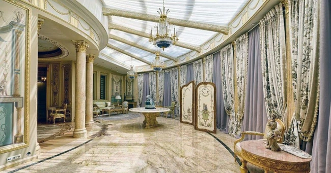În prezentarea palatului, compania care se ocupă de vânzarea imobilului, International Realty Sotheby, scrie: "Interioarele amintesc de palatele baroce. Camerele au o mulţime de aur, piatră naturală şi lemn preţios. În unele camere podelele sunt realizate din marmură naturală, iar sala de biliard şi biblioteca sunt din stejar masiv şi mahon".