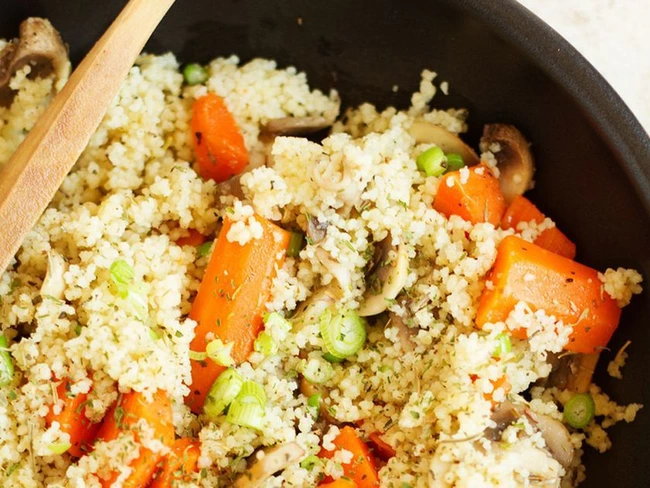 Ingrediente: 250 g cuşcuş, 1 roşie mare, 1 ceapă roşie, 2 căţei de usturoi, ½ zuchini, ½ ardei gras galben , ½ ardei gras roşu, ½ legătură pătrunjel, 4 linguri ulei de măsline, 500 ml supă de legume, 1 lingură zeamă de lămâie, 1 linguriţă chimion pudră, sare , piper.