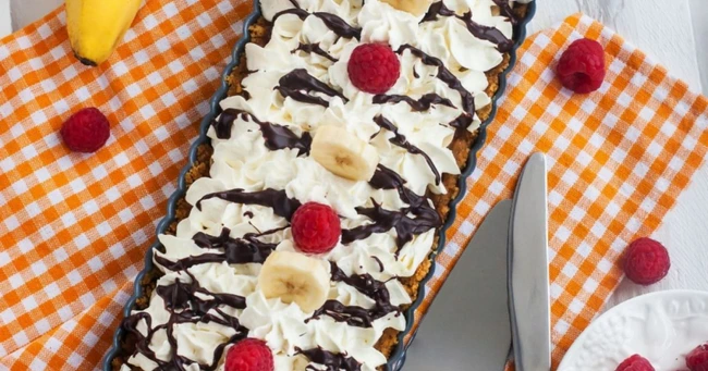 Plăcintă Banoffee este delicioasă, făcută din banane, smântână, caramele şi, uneori, ciocolată sau cafea.