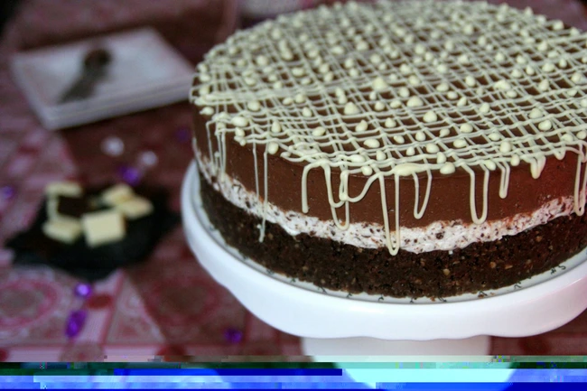 Lăsăm crema de ciocolată să se răcească, apoi adăugăm coniacul. Această cremă o amestecăm cu a treia parte din crema albă rămasă, apoi o întindem în forma de tort.