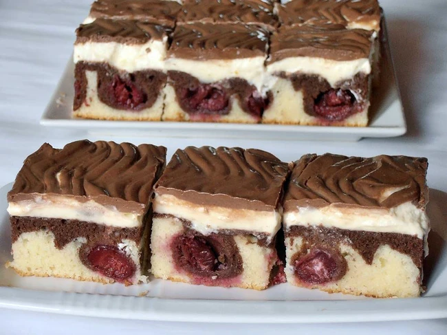 În final, întinde prima parte de aluat în tavă și nivelează. Pune pudra de cacao, care trebuie amestecată cu o lingură de lapte, în cea de-a doua parte de aluat. Omogenizează aluatul și întinde-l peste cel deja pus în tavă. Ulterior, poți presăra vișinele, care trebuie foarte bine scurse, și le poți introduce ușor în aluat.