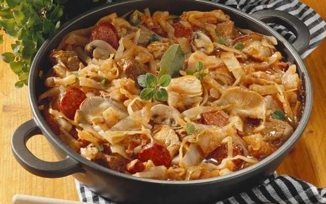 Mâncare de varză nouă cu ciuperci şi cârnaţi