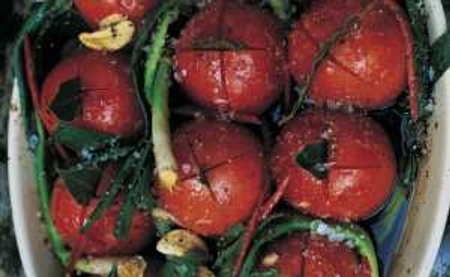 Taie fundul roşiilor destul de adânc, dar nu până la capăt, în cruce. Într-un vas de ceramică presără usturoiul şi busuiocul şi aşază roşiile una lângă alta, iar apoi pune câte o frunză de dafin în tăietură şi condimentează după gust.