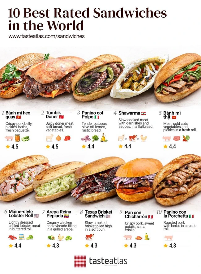 Sandwich-urile sunt printre cele mai rapide, gustoase și versatile preparate culinare din istorie. Au fost inventate în secolul al XVIII-lea de un cartofor înrăit, lordul John Montagu, al IV-lea Conte de Sandwich pentru a putea mânca în timp ce juca cărți, fără a se murdări pe mâini, iar de atunci au devenit extrem de populare pe tot Globul. Nu există om care să nu fi auzit sau să-și fi preparat măcar odată în viață, un sandwich. Ele au devenit parte a culturii fast-food fiind considerate nocive de mulți adepți ai alimentației sănătoase. Cu toate acestea, există destule rețete de sandwich, cu ingrediente naturale și echilibrate care nu numai că ne oferă o mâncare sănătoasă dar ne bucură și papilele gustative. Taste Atlas, renumita enciclopedie culinară online a întocmit un top al celor mai delicioase sandwich-uri de pe Glob. Evident, este vorba despre rețete autentice de pe toate continentele. Iată câteva dintre ele.