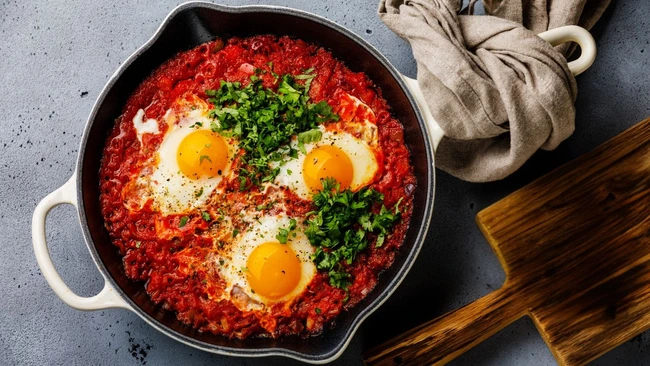 Important este și faptul că modul în care sunt gătite roșiile în rețeta de shakshuka cresc, spun specialiștii, biodisponibilitatea licopenului, fiind mai ușor de absorbit de organism. Pe lângă roșii, ouăle oferă toți cei nouă aminoacizi esențiale pe care organismul nu-i poate produce singur și sunt vitali pentru repararea și creșterea celulelor. În plus, ouăle oferă nutrienți importanți precum colina, vitamina D, vitamina B 12. La rândul lor, ierburile aromatice precum coriandrul sau pătrunjelul sunt o sursă concentrată de vitamine și minerale precum vitamina C, vitamina K și fier. Nu mai vorbim de beneficiile extraordinare ale usturoiului, inclusiv cu proprietăți anticancerigene.