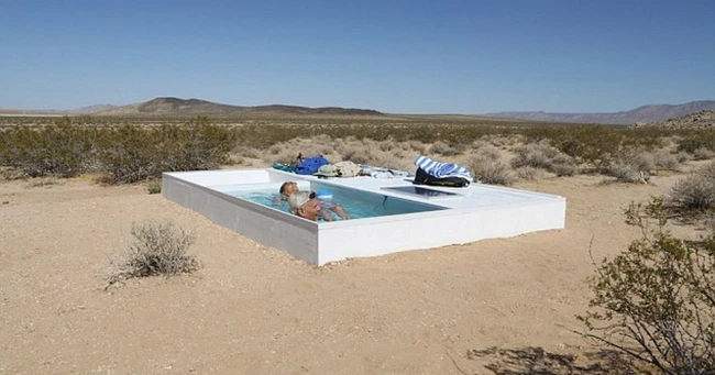 0Un artist de origine austriacă a construit în mijlocul Deşertului Mojave o piscină cu apă rece pentru călătorii care vor să se răcorească. Ei au nevoie de coordonate GPS pentru a o putea localiza.