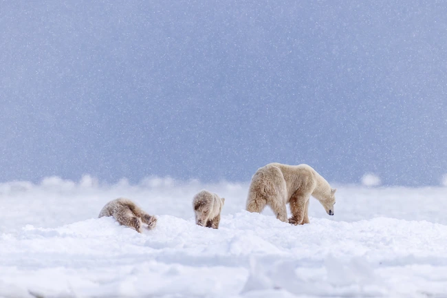 De departe, cel mai frumos moment de astăzi ni l-a oferit o mamă-urs cu doi puiuți atât de jegoși, încât ai fi zis că-s bruni, nu polari. Probabil și-au dat seama că ne place compania lor, așa că s-au dat în spectacol în fața noastră până am degerat din toate încheieturile. I-am privit cum își urmează cu sfințenie mama și îi calcă pe urme, la propriu. Au obosit-o, i-au pus răbdarea la încercare când cădeau prin nămeți sau se hotărau să ia o pauză de joacă. Se aruncau cu susu-n jos prin zăpadă de parcă făceau breakdance. Ea întorcea capul după ei, se oprea de fiecare dată și-i aștepta să se apropie.