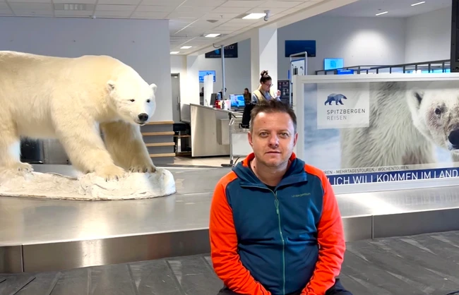 Intru cu viteză în aeroportul minuscul, ca să-mi aștept bagajul cu ochii înlăcrimați de speranță, ca la „Surprize, surprize”. Dacă a trecut și de hopul ăsta, ultimul, sunt cu siguranță cel mai norocos. Singura bandă de bagaje e păzită de un urs polar în dimensiune reală. Pe jos sunt stickere cu urme de urs.