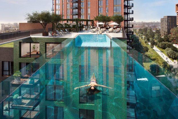 Este considerată piscina din cer. Este suspendată la 35 de metri deasupra solului şi are un fund de sticlă, clienţii curajoţi având posibilitatea să vadă la ce înălţime se află, scrie architecturaldigest.com