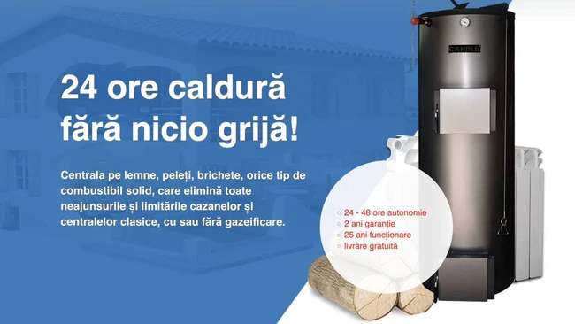 - Autonomie: 24-48 ore cu o singură încărcătura formată din lemn, peleti, brichete, rumeguș, porumb.
