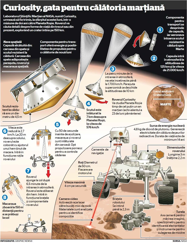 „Craterul Gale ne oferă oportunitatea de a studia mai multe medii, dar şi de a pune în context şi de a înţelege evoluţia acestei planete", a spus John Grotzinger, coordonatorul proiectului. Curiosity este de două ori mai lung şi de cinci ori mai greu decât roverele anterioare folosite de NASA, Spirit şi Opportunity. Roverul va duce pe Marte un set de 10 instrumente ştiinţifice de cercetare, care cântăresc de 15 ori mai mult decât cele folosite de predecesori. „Dacă factorii de mediu nu vor permite lansarea pe 25 noiembrie, atunci vom căuta alte oportunităţi până pe 18 decembrie", au mai spus oficialii NASA.