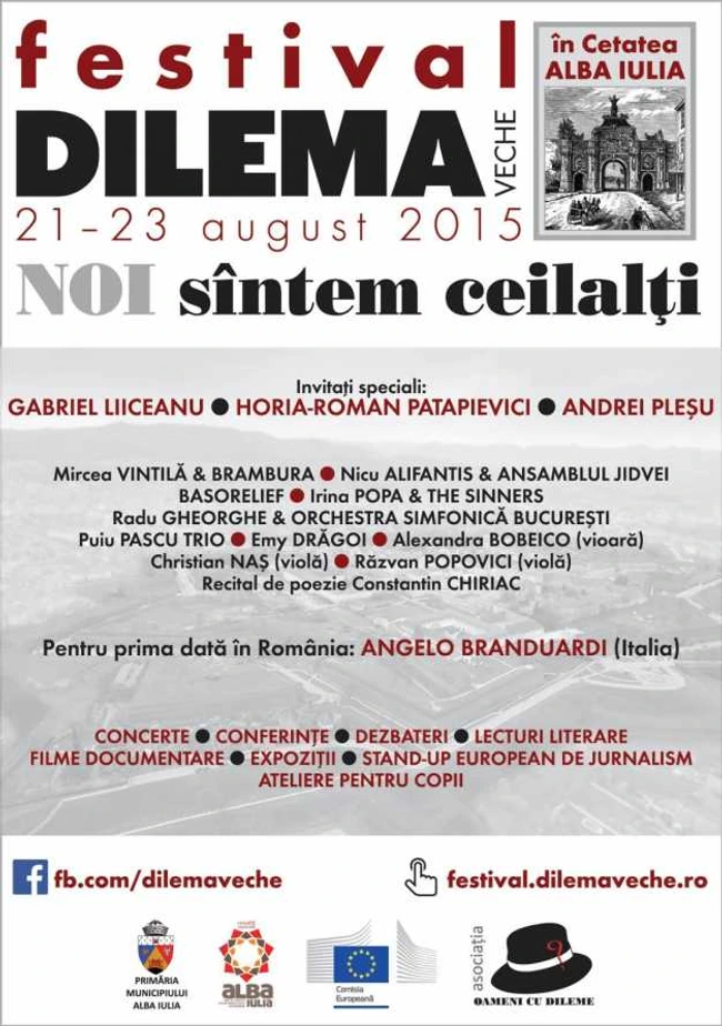 0Festivalul Dilema veche se întoarce la Alba Iulia, între 21 şi 23 august 2015, cu o nouă ordine de zi care răsuceşte minţile: Pleşu, Liiceanu, Patapievici, folk, jazz şi alte fineţuri muzicale, politică europeană şi idei, scriitori şi filme documentare şi, mai ales, bună dispoziţie şi umor dublu rafinat. Aceasta e situaţiunea.