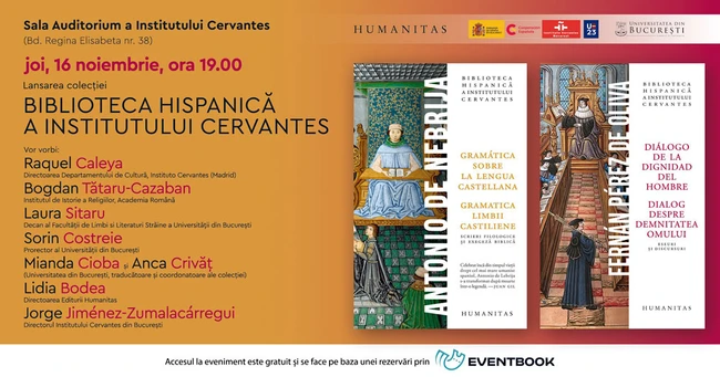 La eveniment vor participa Raquel Caleya, directoarea departamentului de cultură, Instituto Cervantes (Madrid), Bogdan Tătaru-Cazaban, cercetător la Institutul de Istorie a Religiilor, Academia Română, Laura Sitaru, decan al Facultății de Limbi si Literaturi Străine a Universității din București, Sorin Costreie, prorector al Universității din București, Mianda Cioba și Anca Crivăț, traducătoare și coordonatoare ale colecției, profesori la Universitatea din București, Lidia Bodea, directoarea Editurii Humanitas, și Jorge Jiménez-Zumalacárregui, directorul Institutului Cervantes din București.Vor fi prezentate primele două volume ale colecției: Gramática sobre la lengua castellana/Gramatica limbii castiliene: Scrieri filologice și exegeză biblică de Antonio de Nebrija, ediție filologică, studiu introductiv, tabel cronologic, traducere și note de Mianda Cioba și Anca Crivăț, și Diálogo sobre la dignidad humana/Dialog despre demnitatea omului: Eseuri și discursuride Fernán Pérez de Oliva, ediție și traducere de Mianda Cioba.Accesul este liber, în limita locurilor disponibile, pe baza unei rezervări prin Eventbook.