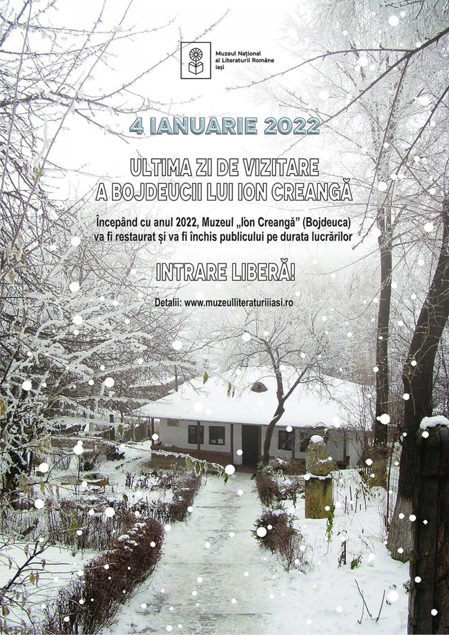 0Muzeul „Ion Creangă” (Bojdeuca) va putea fi vizitat gratuit pe 4 ianuarie 2022, ultima dată înainte de începerea lucrărilor de restaurare care vor dura 2 ani, informează instituţia.