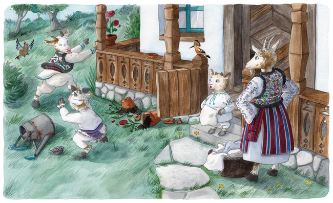 Da, da. Am pus mai ales jucării – cuburi de lemn, m-am gândit la copilăria mea, un urs de pluș. Mi-am dorit să arăt cât de jucăuși erau iezișorii, însă îmi place să mai introduc în ilustrații anumite lucruri din copilăria mea. Îmi place că astfel poate vor afla și ei cum a fost când eram eu mică. Nu e cazul aici, dar aș fi pus și un telefon cu fir dacă avea capra telefonie fixă (râde). Îmi plac mult lucrurile acestea mai vechi – într-o scenă am desenat chiar și fierul acela de călcat care avea cărbuni, multe vase ceramice.