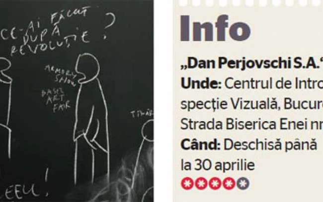 0Desenele artistului, realizate cu cretă albă pe pereţi negri, pot fi văzute până la 30 aprilie, la galeria Centrului de Introspecţie Vizuală. „Dan Perjovschi S.A.“ reprezintă primul capitol dintr-o serie de expoziţii-concept, grupate sub titlul „1990-2010“, care au ca subiect investigarea scenei de artă din România, în ultimii 20 de ani.